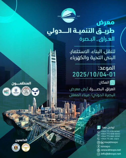 المعرض الدولي العراقي لتطوير الطرق، البناء، البنى التحتية والكهرباء. يهدف إلى خلق مسارات نقل تربط العراق بالدول المجاورة، وبالتالي زيادة التجارة والتن...
